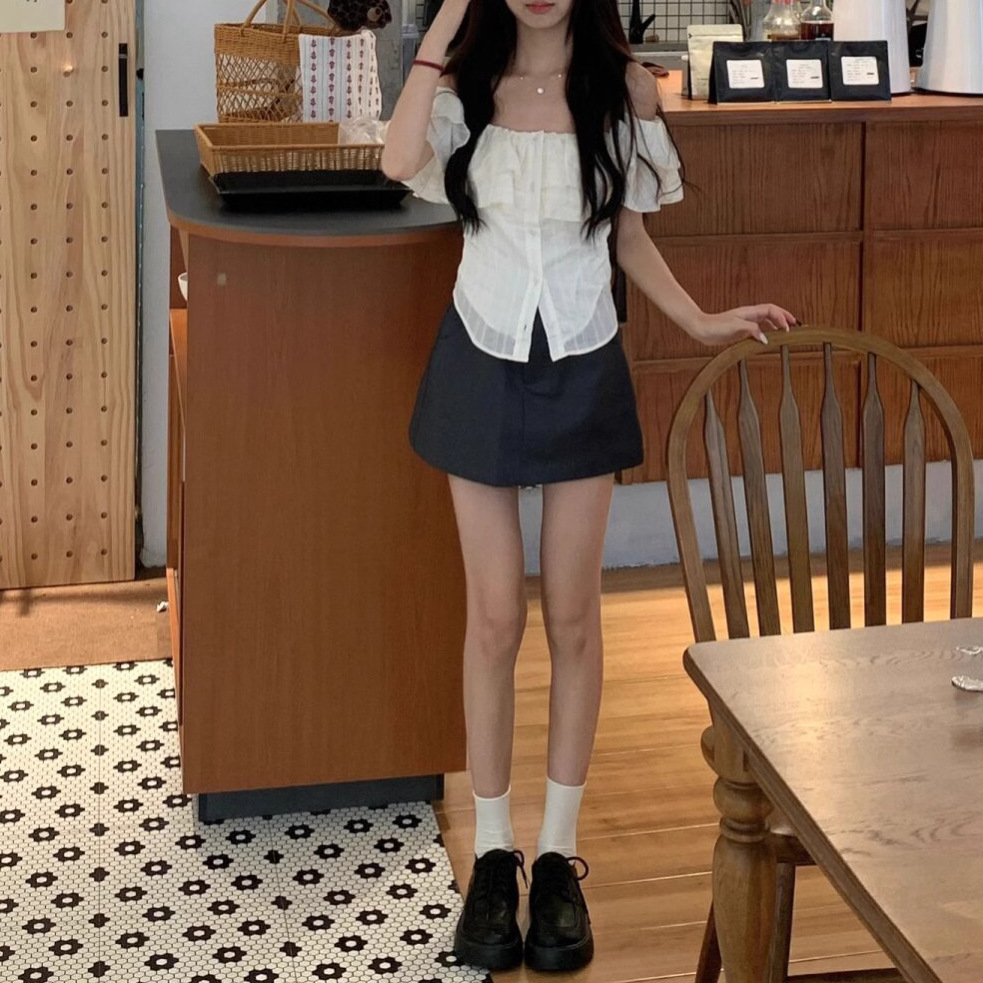 Rok Set Gaya Manis dan Pedas Pelajar Wanita Musim Panas Kemeja Bahu Terbuka Kerah Slim Fit dengan Rok Setengah Badan Menutupi Pinggul Dua