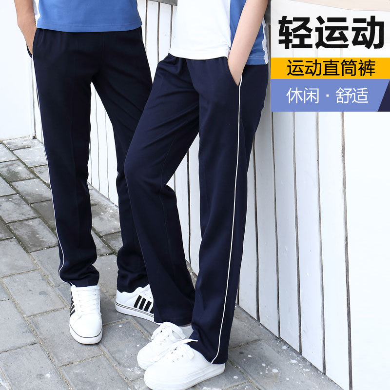 Celana sekolah biru celana olahraga pria dan wanita celana seragam sekolah siswa SMA pria celana panjang pria tepi putih tepi tipis pakaian kelas Musim Semi dan Musim Gugur