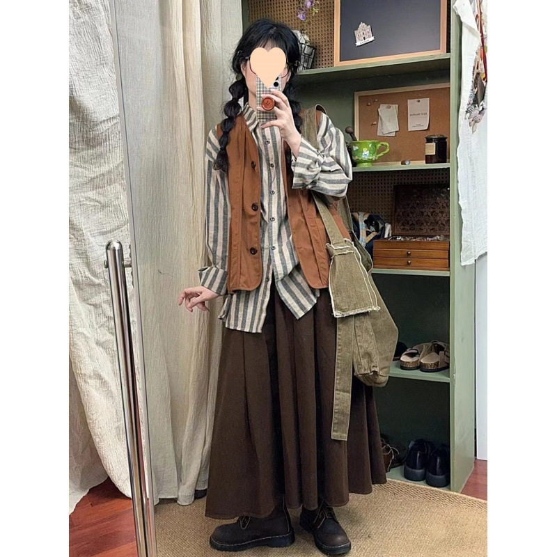Setelan Kemeja Kasual Rok Setengah Badan Retro Musim Gugur Murid Wanita Rompi Sederhana Gaya Mori Gaya Jepang