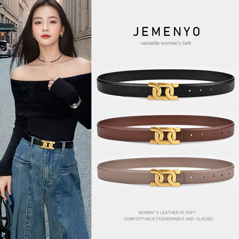 Sabuk kulit asli wanita, sabuk kulit asli semua cocok dekorasi ketat dengan setelan jeans hitam retro dengan mode 2024