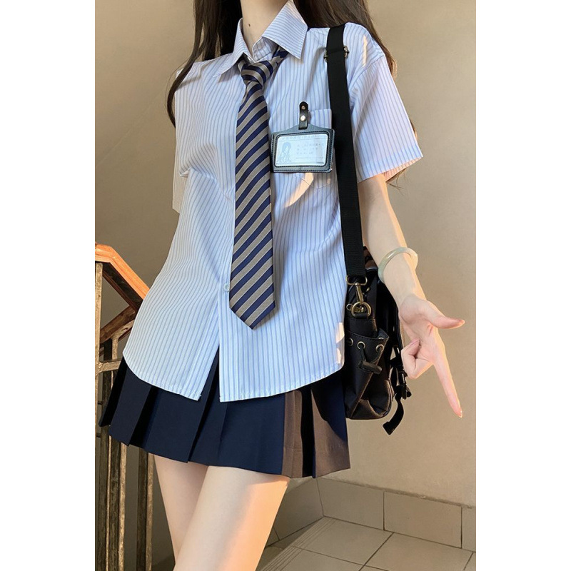 Kemeja Bergaris Seragam JK Jepang Setelan Rok Lipit Gaya Kampus Setelan Dua Potong Kemeja Musim Panas Model Baru Rambut Lurus Pabrik