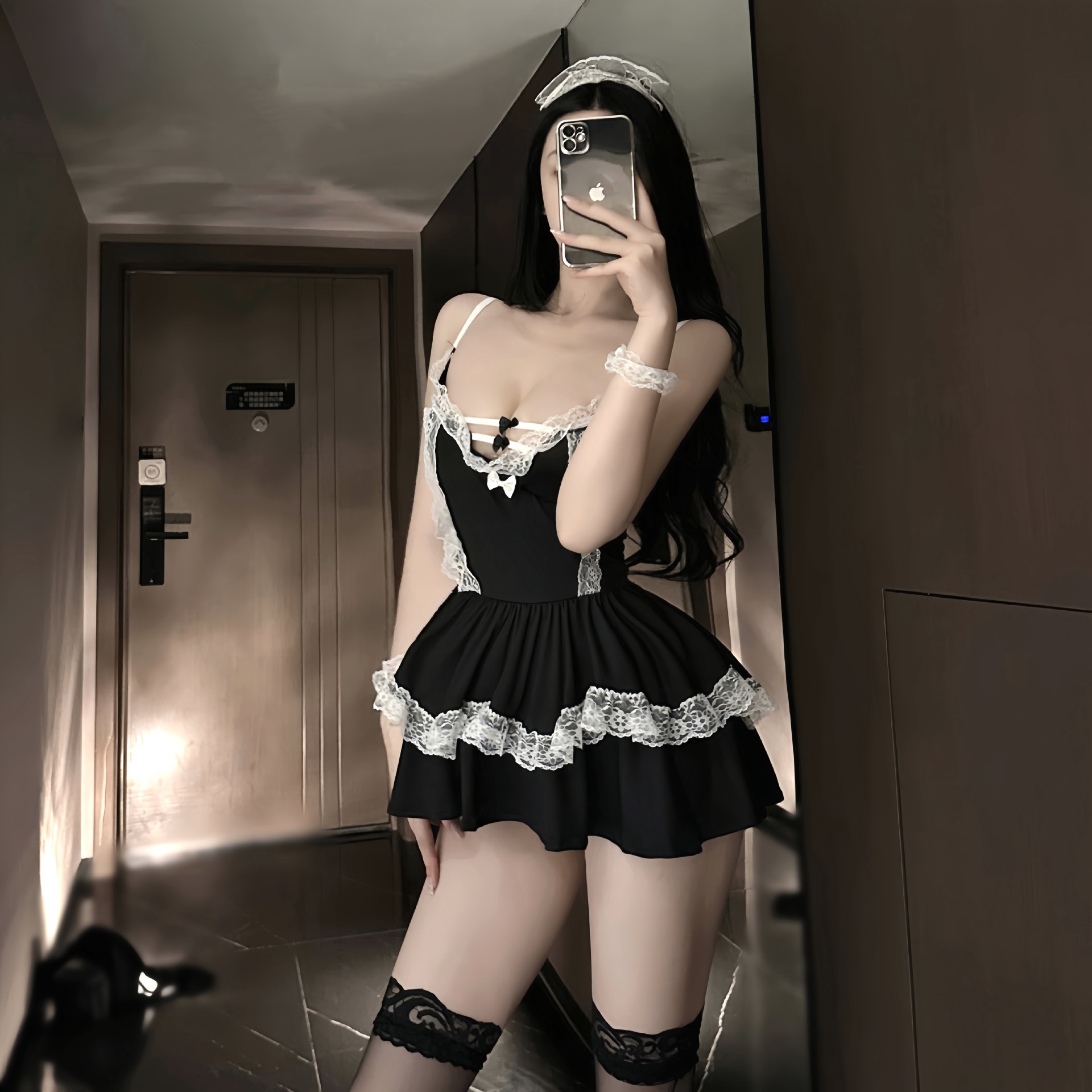 Lingerie seksi AliExpress Eropa dan Amerika, permainan peran renda berongga, seragam pelayan seksi tiga titik, setelan seragam pelayan