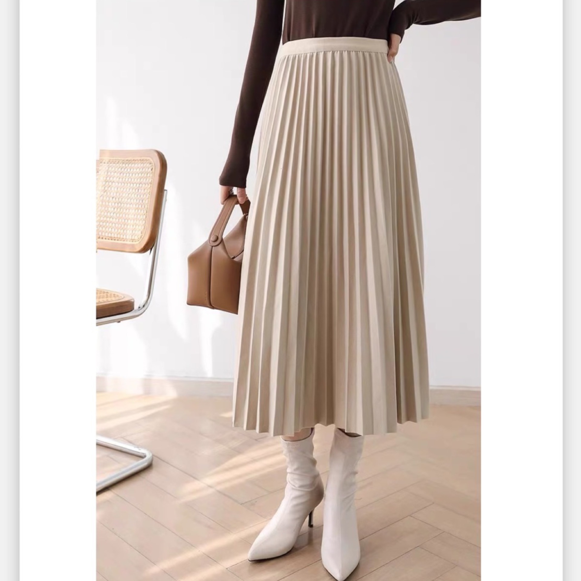 Rok midi lipit wol untuk musim gugur dan musim dingin 2024, warna solid baru yang lebih tebal, ramping, model A-line, pinggang tinggi