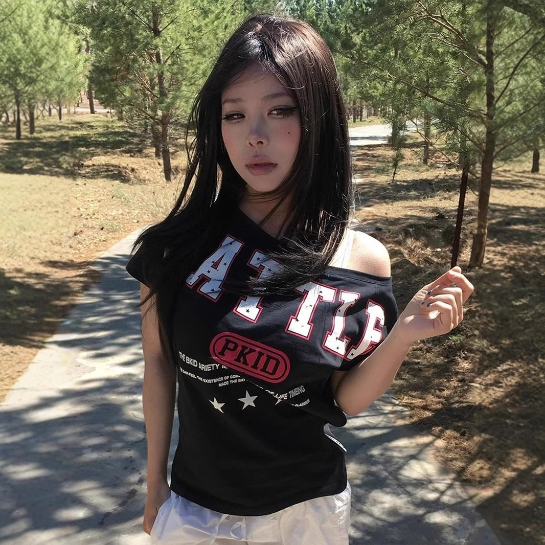 T-Shirt Lengan Pendek Katun Murni T-Shirt Lengan Setengah Print Bahu Terbuka Berat Bahu Terbuka Pakaian Atasan Pakaian Kelas Bahu Miring Bertekstur Keren