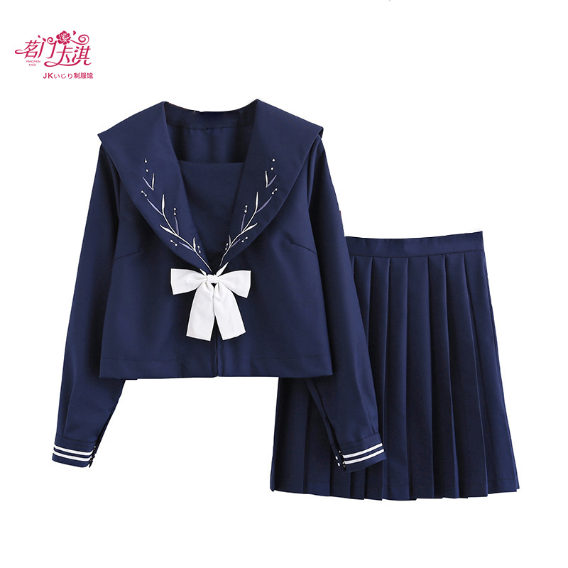 Seragam tiga JK air hitam biru asli gelap buruk pakaian pelaut Tengah gaya kampus setelan lengan panjang dasar