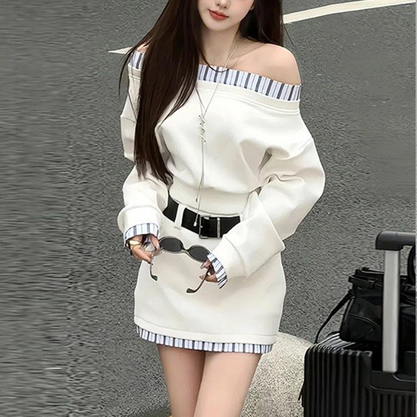 休闲运动套装女秋季韩系修身斜肩撞色长袖卫衣半身裙子春秋一整套