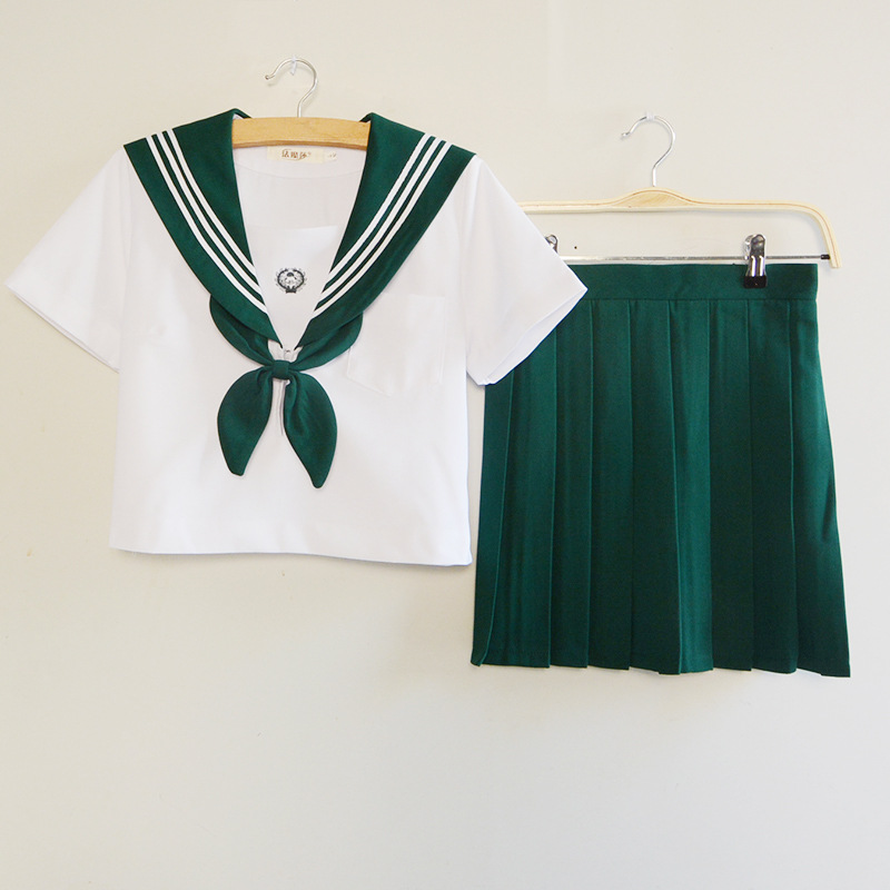 Setelan pelaut baru musim panas Guan Xi placket jk kerah hijau gelap lengan pendek putih tiga buku seragam setelan siswa dalam stok grosir