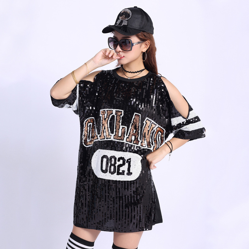 2023 wish populer kaos lengan pendek panjang gaun longgar pertunjukan tari berpayet bahu terbuka untuk wanita