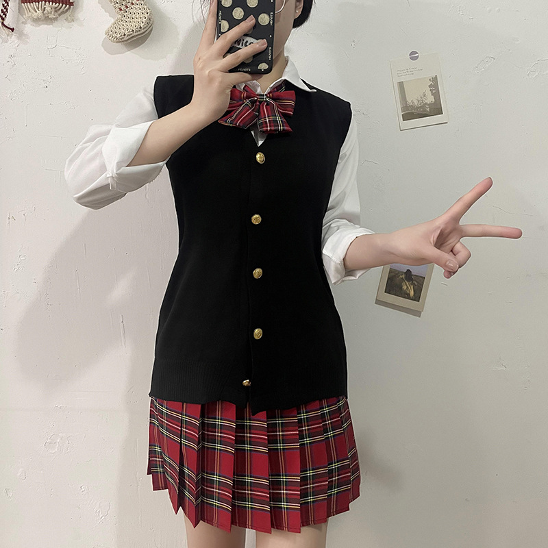 Setelan Rok Berkotak Seragam JK Model Tipis Gaya Kampus Sweater Kardigan Rajutan Murid Wanita Rompi Leher V