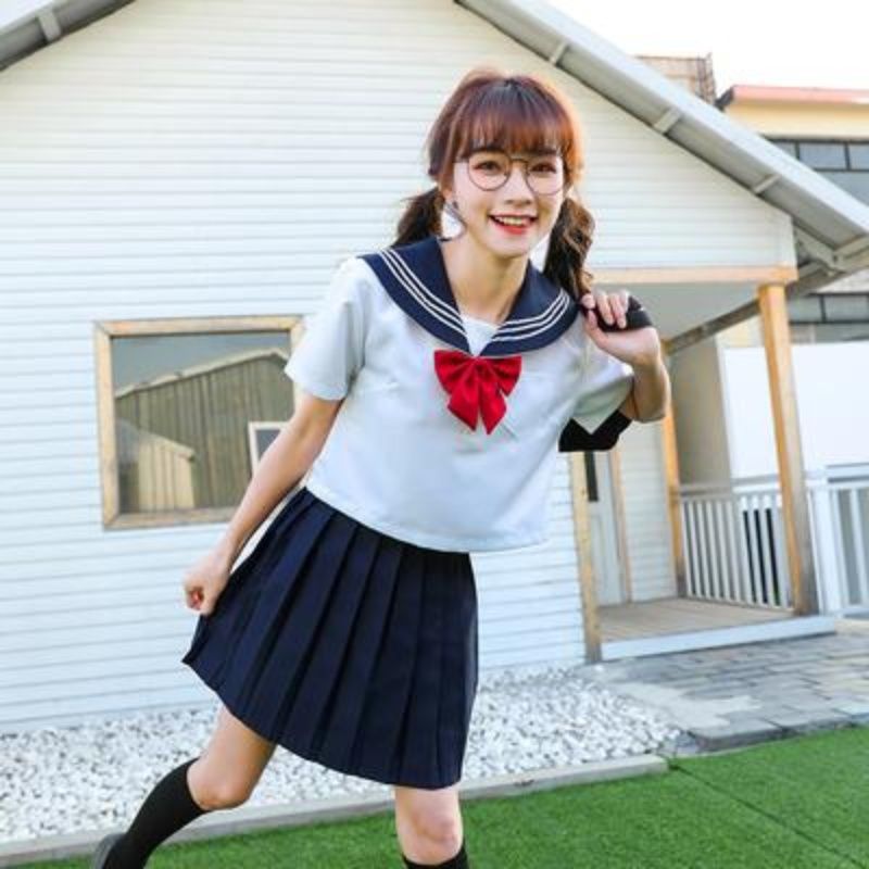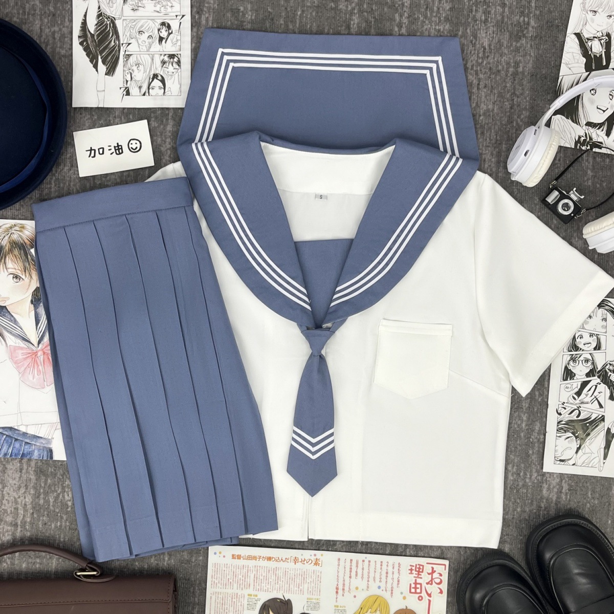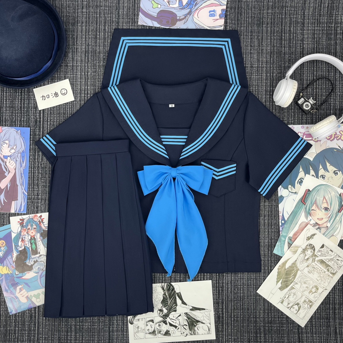 Jepang gaya biru laut putih tiga modifikasi dasar JK seragam musim panas pakaian wanita siswa pelaut setelan seragam sekolah Tengah pakaian