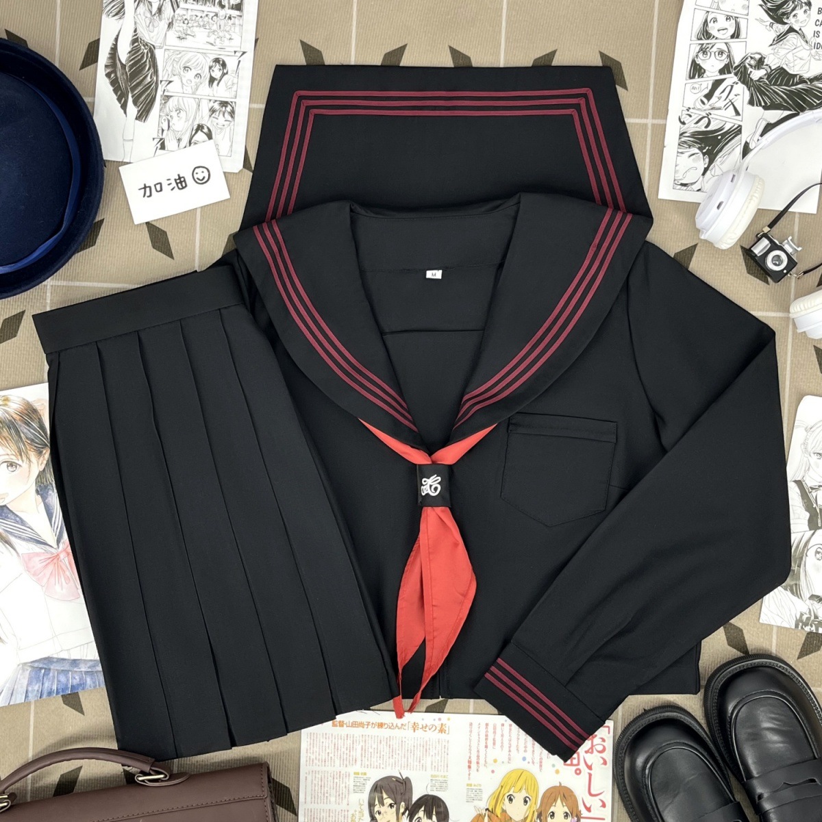 Seragam pelaut Jepang tiga potong warna merah, gaya dasar, seragam JK gaya kampus untuk cewek keren, set rok lipit hitam, tersedia.