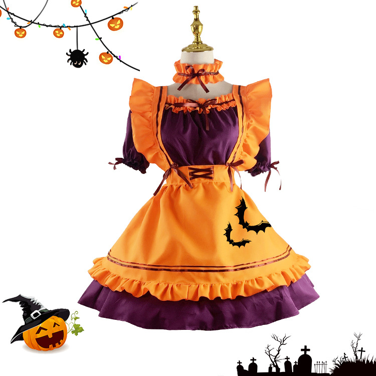 Kostum pelayan labu kostum cosplay pertunjukan pesta Halloween kostum penyihir ajaib gaun kelelawar labu