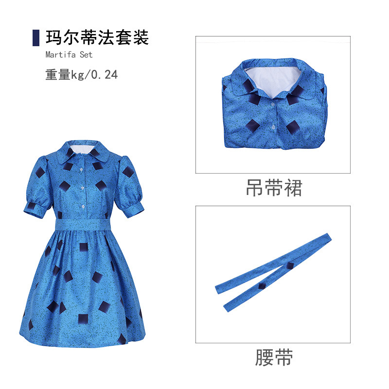 Setelan cos Matilda kostum cosplay setelan pertunjukan panggung gaun cetak biru anak-anak kostum Halloween