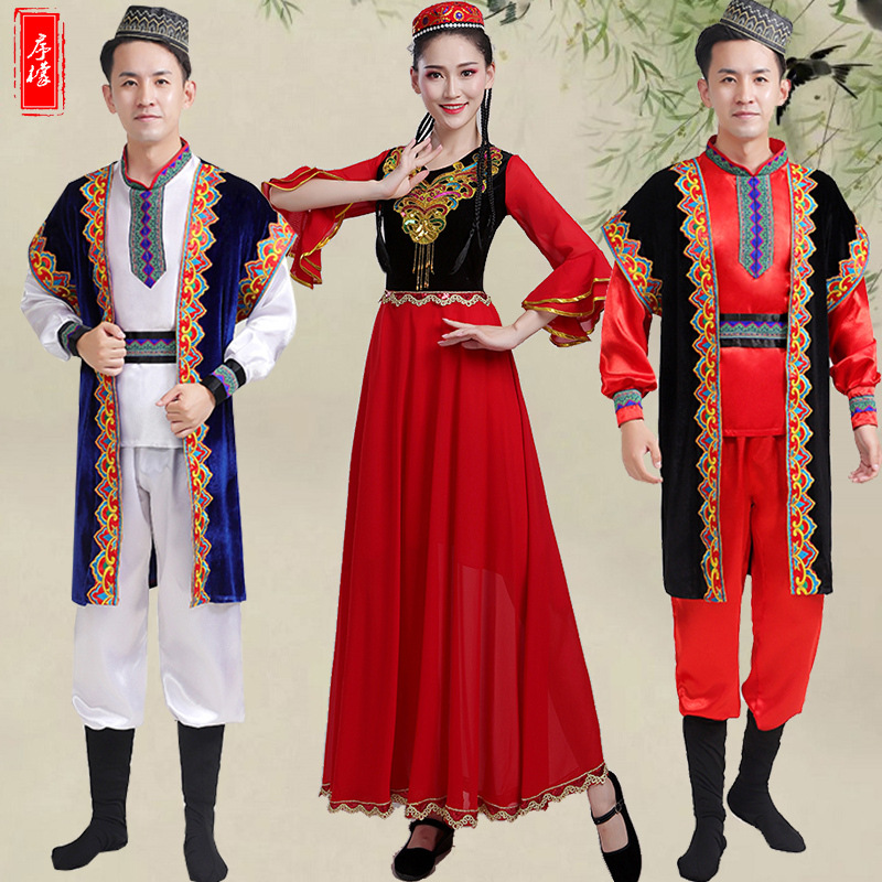 Kostum dansa Xinjiang pria dan wanita gaya etnik wanita pembukaan dansa besar rok ayunan seni performa ujian pakaian gaun dewasa