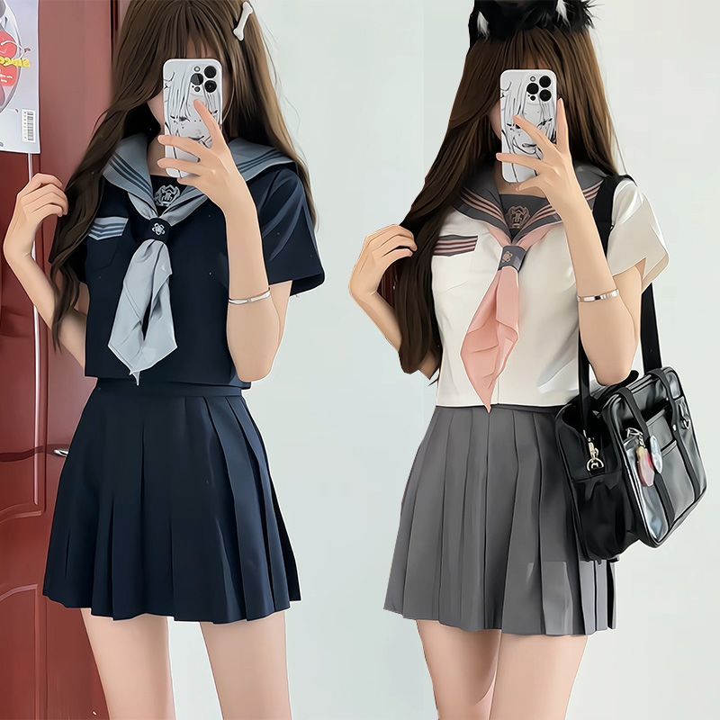 Orisinal Jam Musim Panas Gaya JK Pakaian Sair Model Pinggang Baju Seragam Gaya Kampus Wanita Musim Panas Lengan Pendek