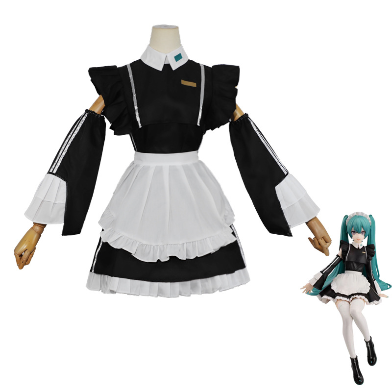 Hatsune Miku cos setelan hitam dan putih, setelan pelayan dua dimensi lengan pendek, setelan cosplay anime wanita