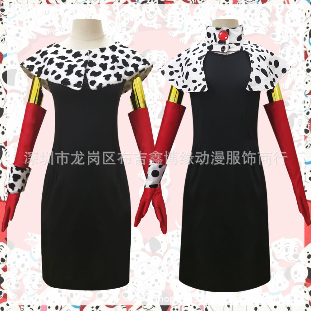 101 anjing setia wanita jahat hitam dan putih syal hitam dan putih penyihir kuila cos pakaian gaun cosplay Halloween
