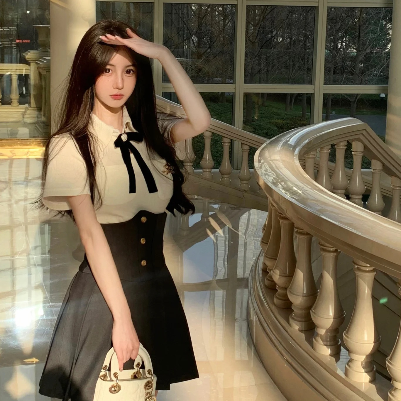 Setelan Dua Potong Lengan Pendek Warna Putih Musim Panas Wanita Gaun Setengah Tubuh Ketat Pinggang Tulang Ikan Setelan Seragam Jk Gaya Sekolah Gadis Pedas Amerika