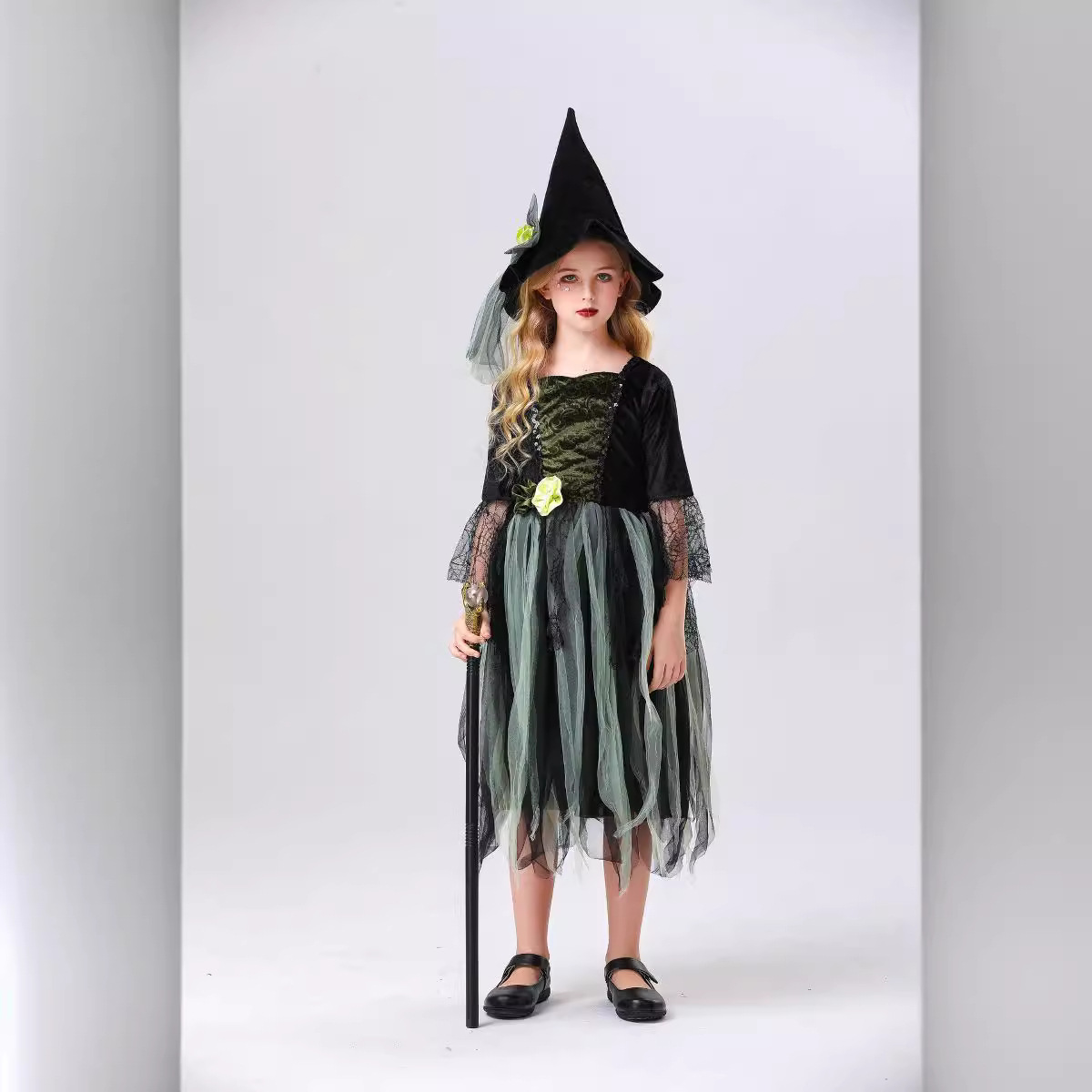 Pakaian Pertunjukan Penyihir Anak Halloween Model Baru Gaun Penyihir dengan Topi Pakaian Bermain Peran Grosir