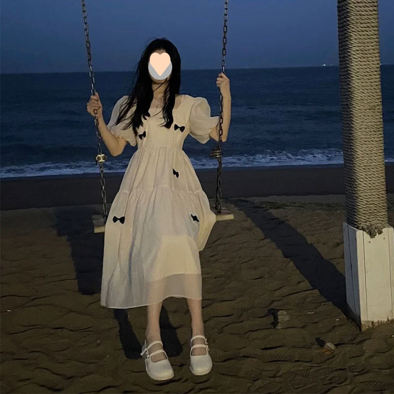 Rok Cinta Pertama Gaun Kerah Mulut Persegi Cahaya Bulan Putih Rok Peri Model Panjang Sedang Lengan Pendek Model Baru Musim Semi Musim Panas