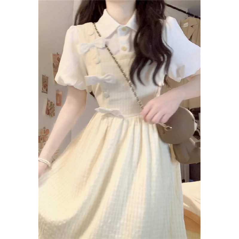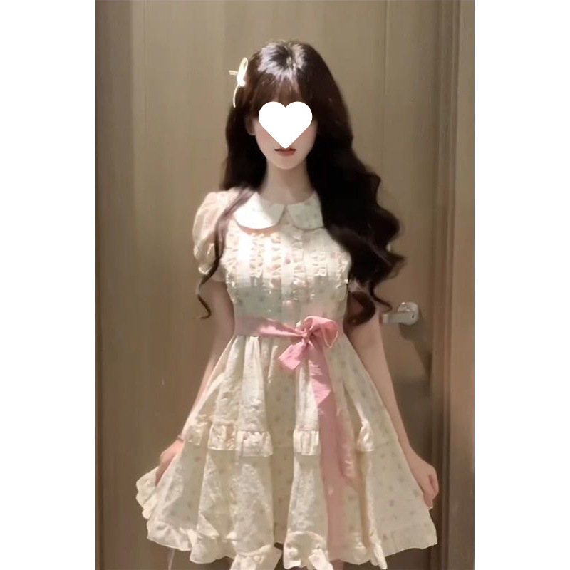 Rok A-line Terlihat Langsing Ketat Pinggang Lengan Gelembung Kerah Boneka Manis Pria Kecil Gaya Jepang Gaun Putri Musim Panas Wanita