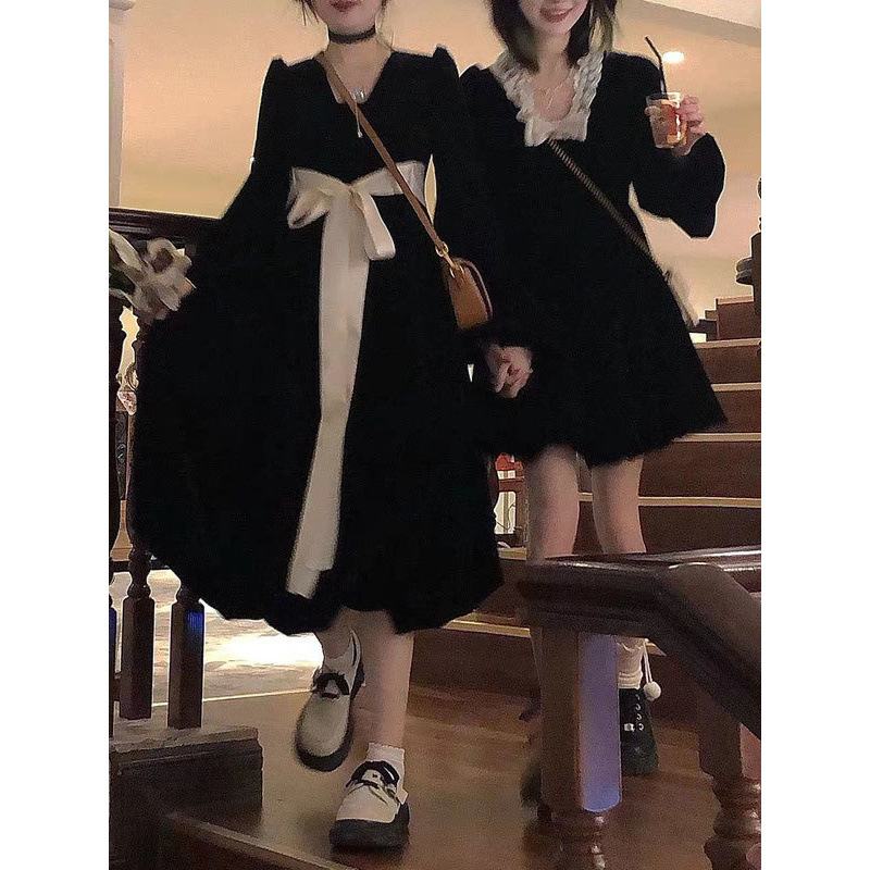 Gaun Dua Potong Palsu Manis Gadis Lembut Pita Kupu-Kupu Rok Lembut Model Panjang Sedang Gaya Sekolahan Model Baru Musim Gugur Musim Dingin Wanita