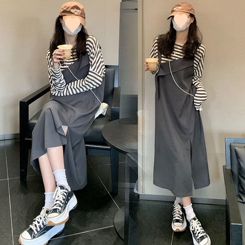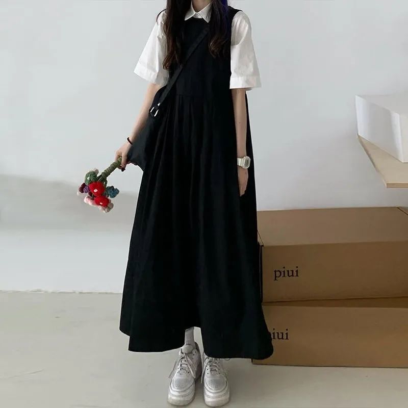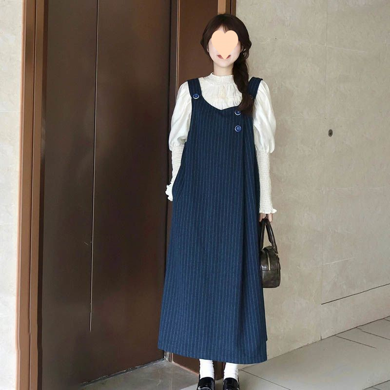 Setelan Satu Potongan Kemeja Murid Sekolah Versi Korea Musim Semi dan Musim Gugur Wanita Gaun Tali Tali Panjang Sedang Membentuk Pinggang