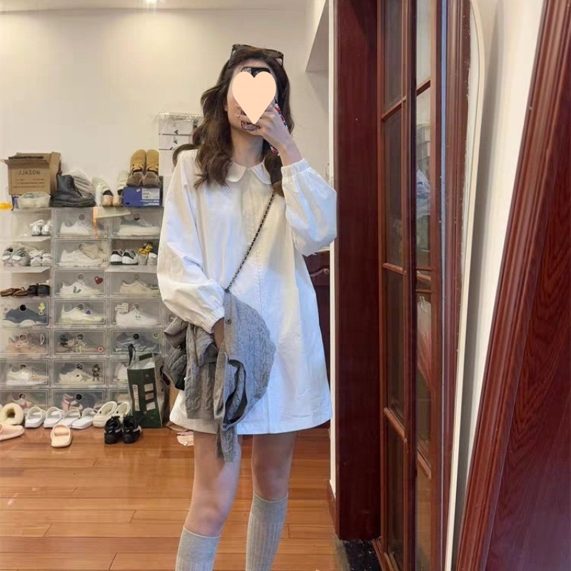 Gaun Putih Kolese Pria Kecil Rok Pendek Model Baru Longgar Wanita Rok Kemeja Kerah Boneka Model Setengah Panjang Rok Lengan Panjang Murid
