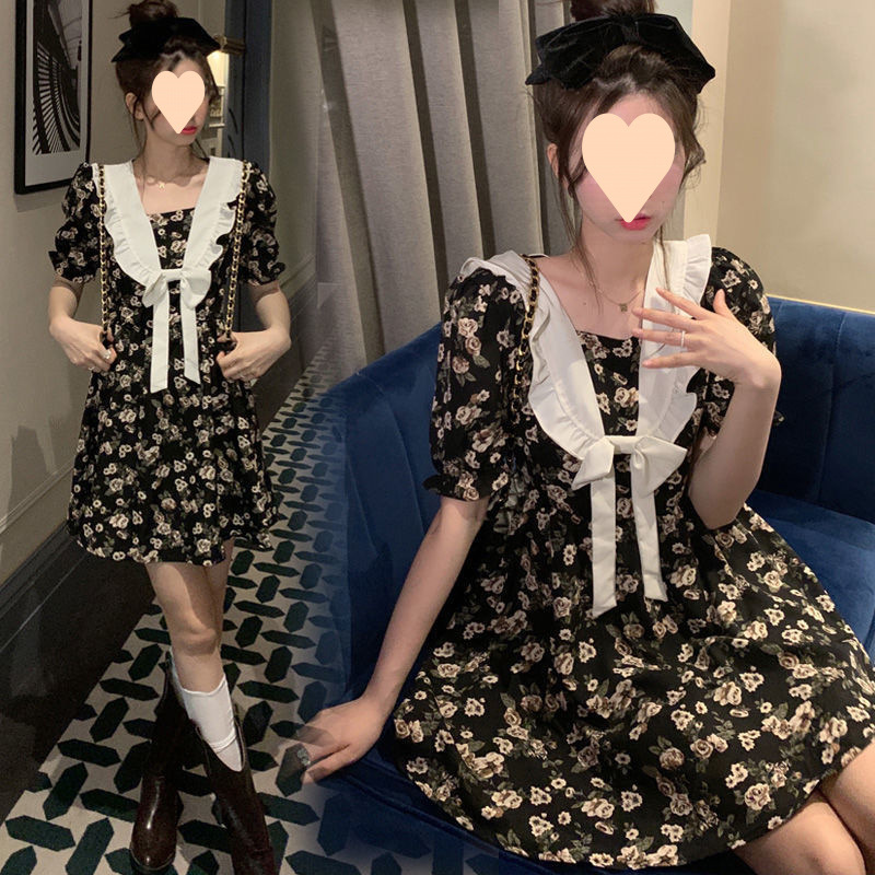 Gaun Bunga Kecil Ukuran Besar Kerah Angkatan Laut Musim Panas Rok Peri Gaya Perancis Membentuk Pinggang Rok Pendek Huruf Gaya Murni Murid