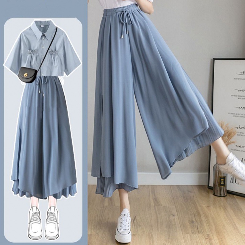 Setelan pakaian Musim Panas 2024 baru kaus pendek gaya Korea pelajar + celana kaki lebar potongan dua potong