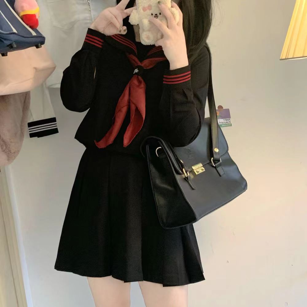 Setelan pelaut lengan panjang Jepang, hitam tiga jk seragam gaun buruk pakaian Tengah gaya kuliah asli setelan dasar