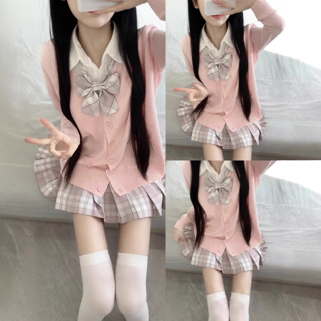 Setelan JK Seragam Wanita Asli Model Musim Gugur dan Musim Dingin Rok Kardigan Rajutan Kardigan Rajutan Dipakai Satu Set Lengkap