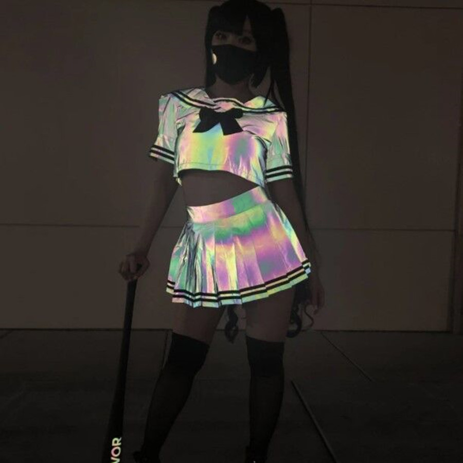 Setelan pakaian pelaut reflektif warna-warni Amazon Cross-border kaus wanita lucu seksi Jepang setelan rok berlipat reflektif
