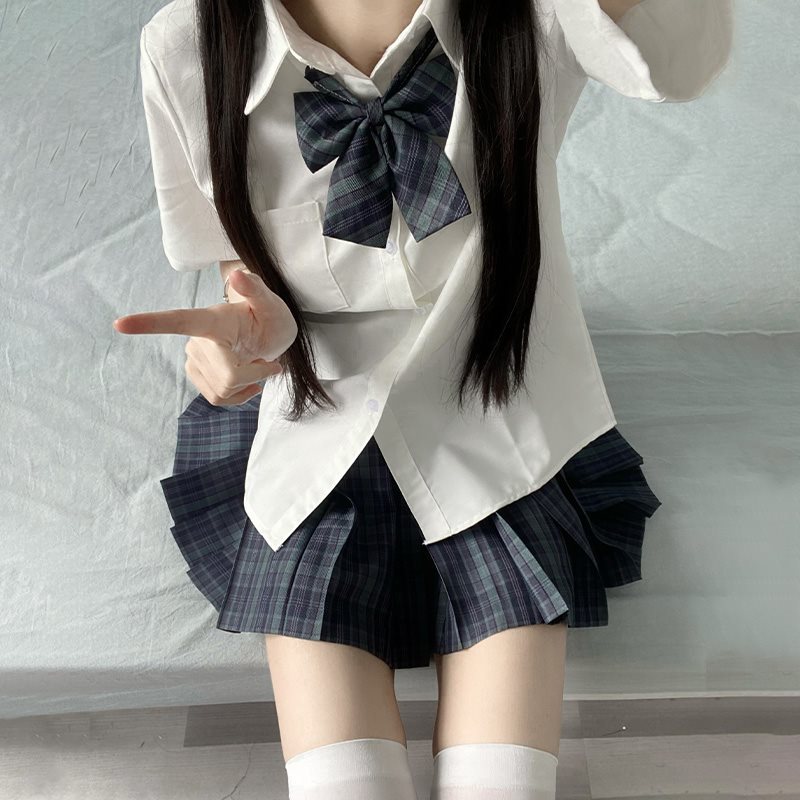 Kemeja Seragam JK Gaya Jepang Lengan Pendek Pakaian Kelas Model Baru Musim Panas Gaya Sekolahan Terlihat Langsing Model Dasar Set Rok Lipit