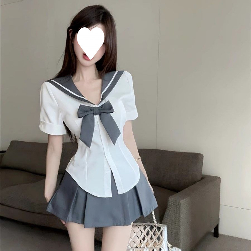 Setelan Gaya Kampus JK Desain Kemeja Dasi Lengan Pendek Longgar Kerah Angkatan Laut Rok Pendek Setengah Badan Lipit Pinggang Tinggi Wanita