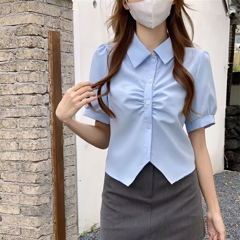Kemeja Lipat Sederhana Elegan Warna Biru Gaya Perancis Kemeja Lengan Pendek Elegan Manis dan Pedas Terlihat Langsing Pinggang Atasan Model Pendek Musim Panas