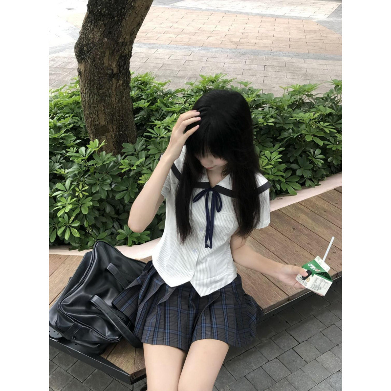 Setelan Baju Kemeja Lengan Pendek Wanita Seragam Gaya Perguruan Tinggi Jepang JK Rok Pendek Cake Bergaya Murni Gaya Pelangsing Pinggang Set Dua Potong