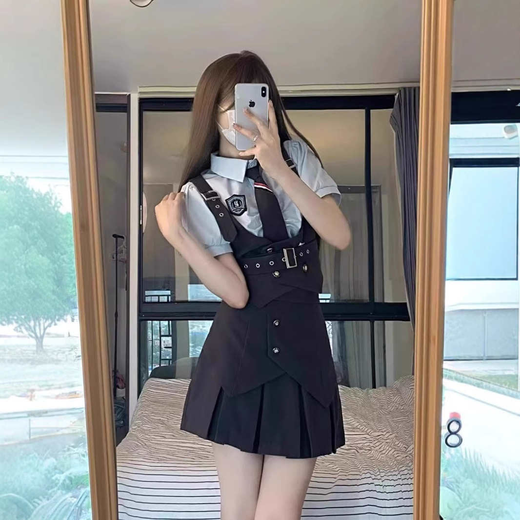 Setelan Gaya Sekolah Gadis Pedas Amerika Kemeja Warna Hitam Biru Seragam Polisi Kelinci JK Rok Lipit Rompi 3 Set