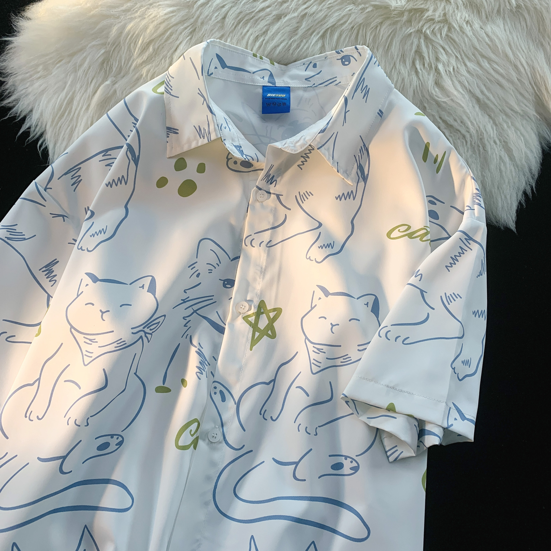 Kemeja lengan pendek motif kucing kartun pelajar pria wanita, kemeja trendi gaya bf manis ukuran ekstra besar longgar musim panas untuk pria dan wanita