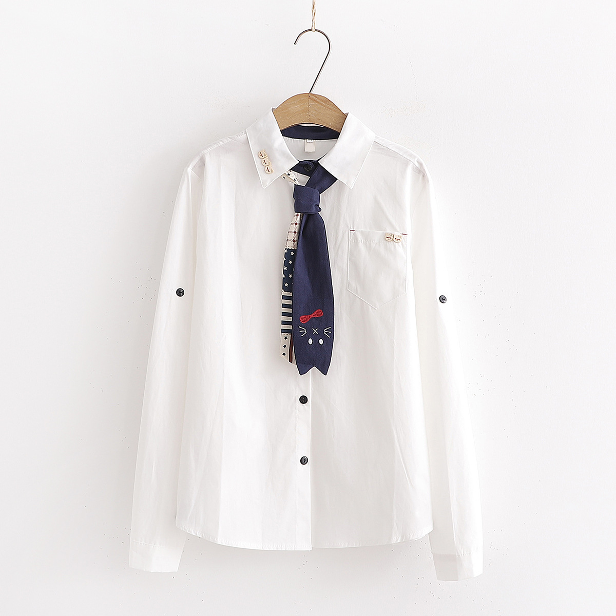 Kemeja kecil kerah boneka bordir gaya Jepang artistik longgar semua-cocok kemeja lengan panjang pelangsing siswa muda kemeja kecil