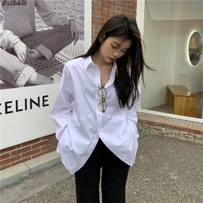 C669-white kemeja wanita lengan panjang sedang gaya Korea longgar serbaguna siswa musim semi dasar kemeja bf ukuran besar