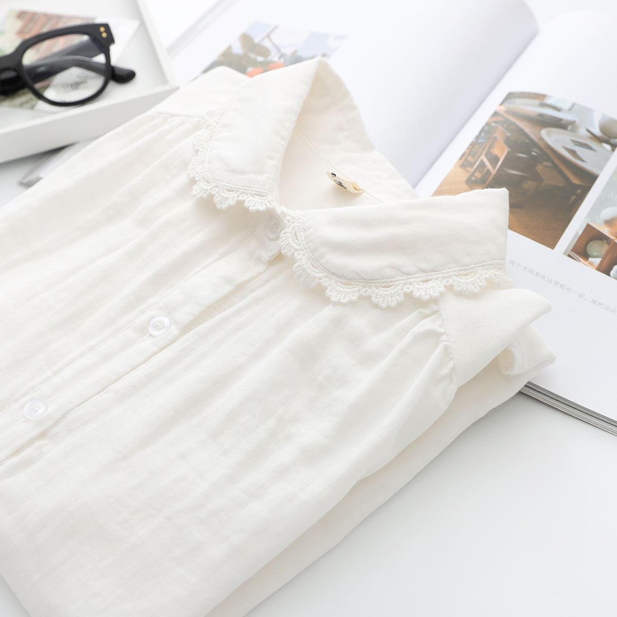 Kemeja lengan panjang benang katun wanita, kemeja renda putih longgar netral musim gugur untuk pelajar