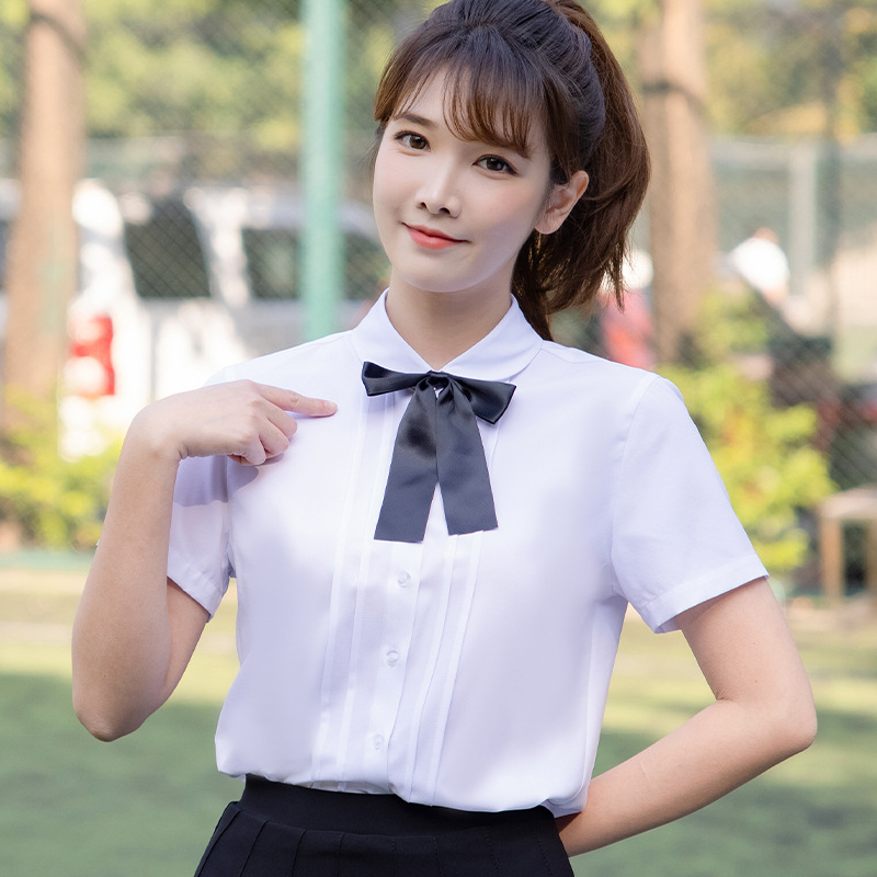 Kerah boneka kemeja putih lengan pendek, kemeja atasan gaya Inggris wanita dengan pita kupu-kupu untuk kelas TK musim panas