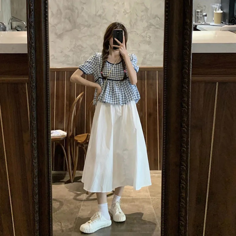 Kemeja Kotak-Kotak Lengan Busa Longgar Kustom Kemeja Musim Panas Model Boneka Pola Kotak-Kotak Tingkat Tinggi Gaya Retret Siswa Perempuan
