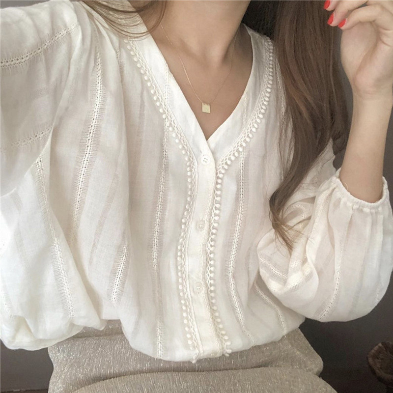 Kemeja Lengan Panjang Kerah Kemeja Renda Lengan Puff Wanita Kemeja Musim Gugur Lengan Panjang Warna Putih Versi Korea Atasan Pelajar Longgar