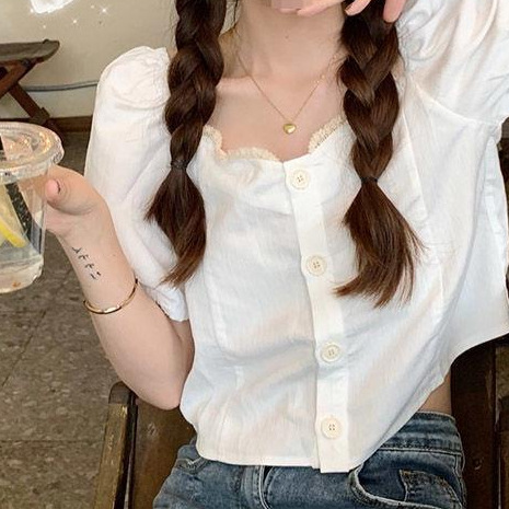 Kemeja lengan puff kerah persegi Retro baju kecil manis Perancis musim panas wanita kemeja fashion Putih lace-up desain