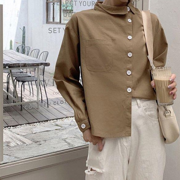 Kemeja lengan panjang warna polos untuk wanita, mantel kemeja gaya Korea ramping longgar musim semi 2024 untuk pelajar wanita