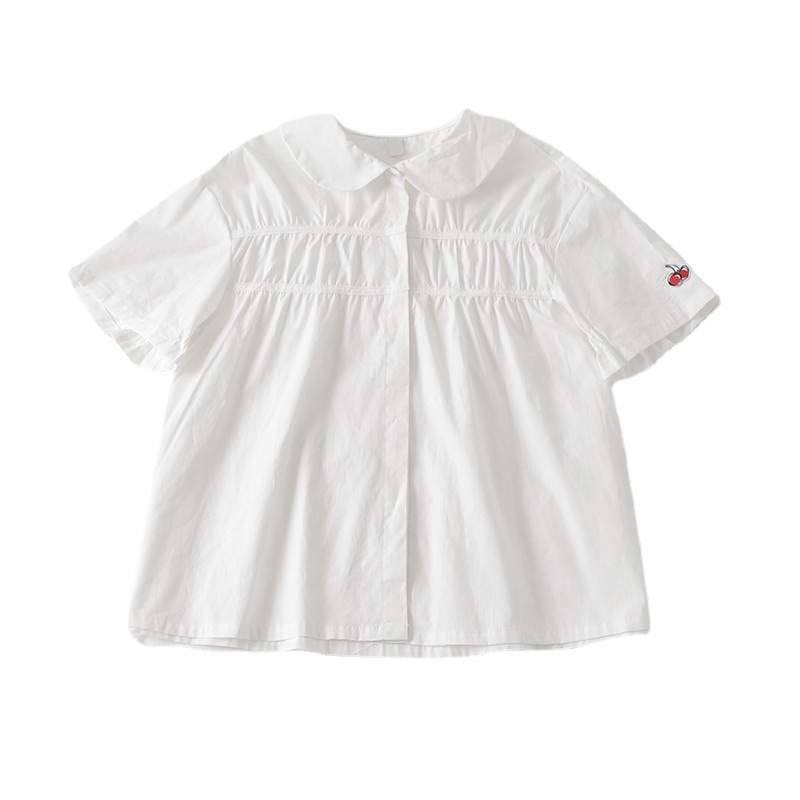 Kaus serut renda anak perempuan, atasan kerah boneka lucu bordir ceri, tali serut gaya Jepang lengan pendek longgar musim panas untuk pelajar perempuan