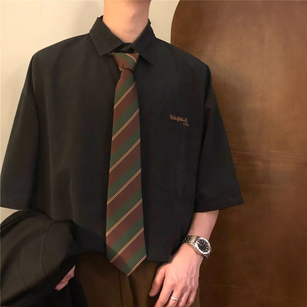 Kemeja Lengan Pendek Gaya Tinggi Warna Hitam Retro Gaya Amerika Model Baru Musim Panas Kemeja Mudah Dipadu Padan Merek Trendi Longgar Kasual Pelajar Pria