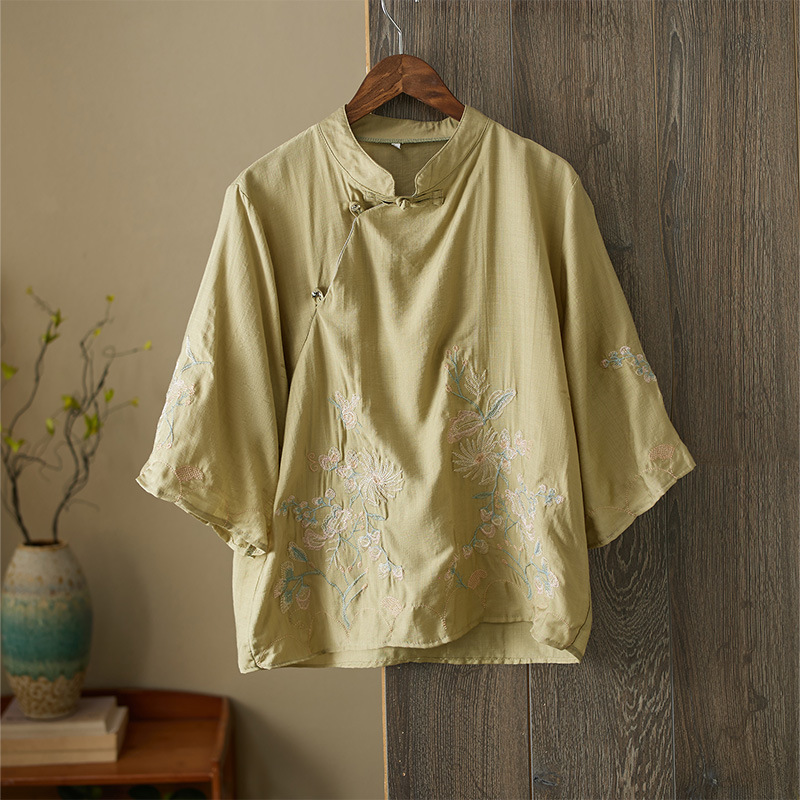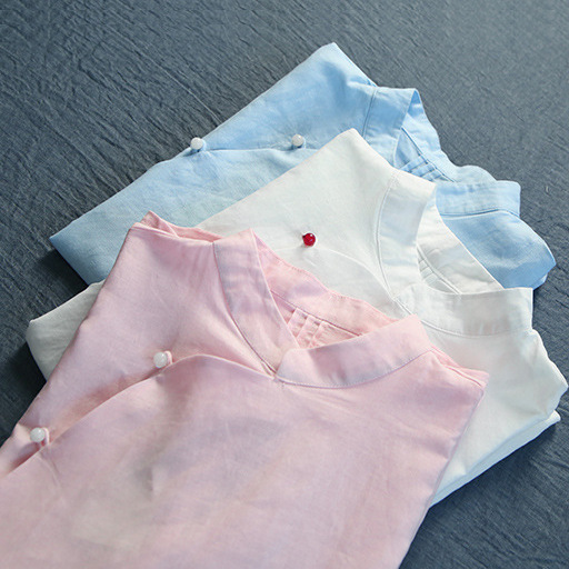1463 artistik retro katun dan linen kemeja kerah berdiri atas lengan lonceng kelelawar Republik pendek gaya Cina pakaian wanita untuk siswa Musim Semi